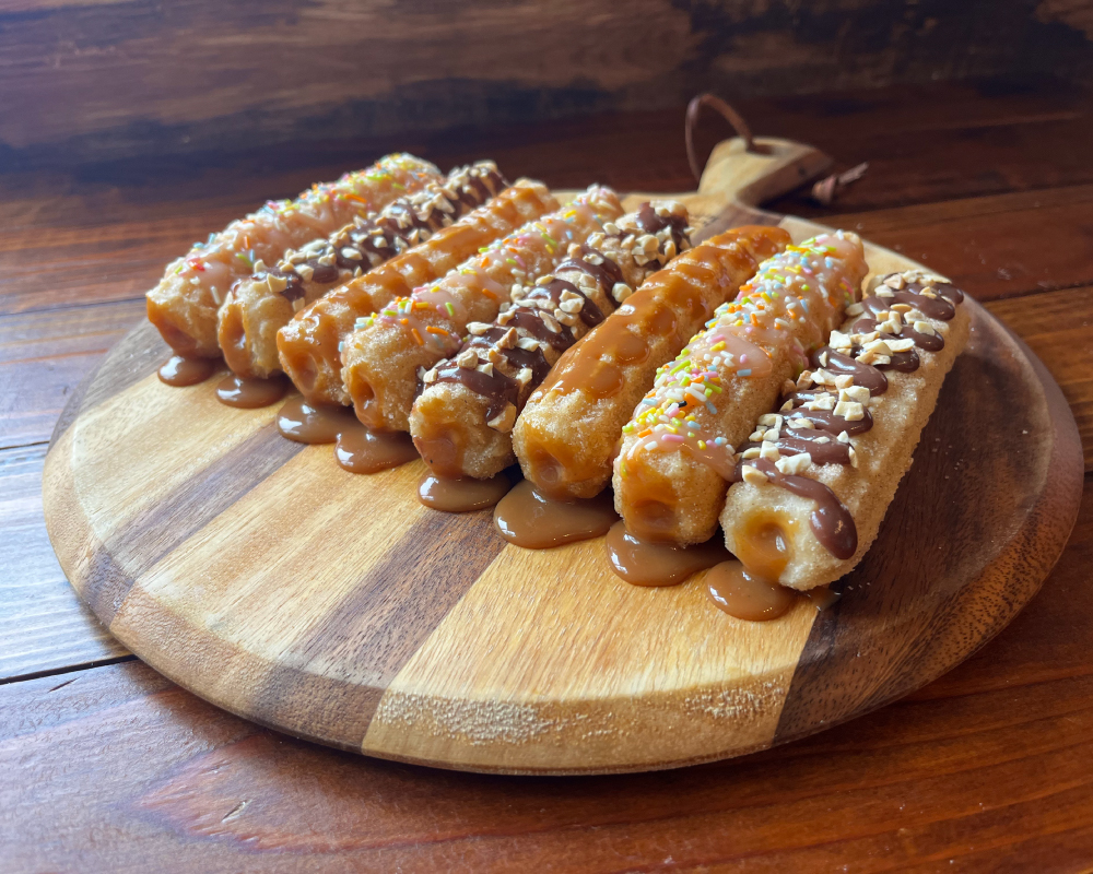 揚げたてザクザク香ばしい生地にキャラメル入りトッピング:シナモンシュガー・キャラメル・いちごキャラメル・チョコキャラメル