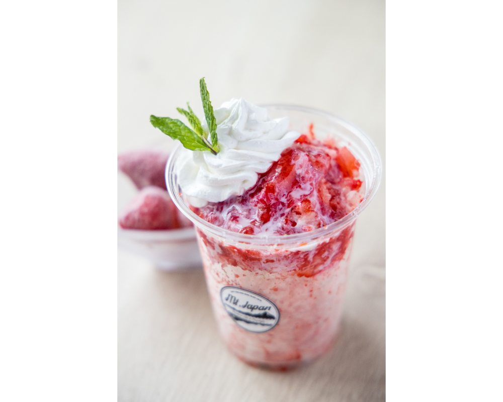 キンキンに凍らせた生いちごを削りシロップとクリームで仕上げるスイーツ