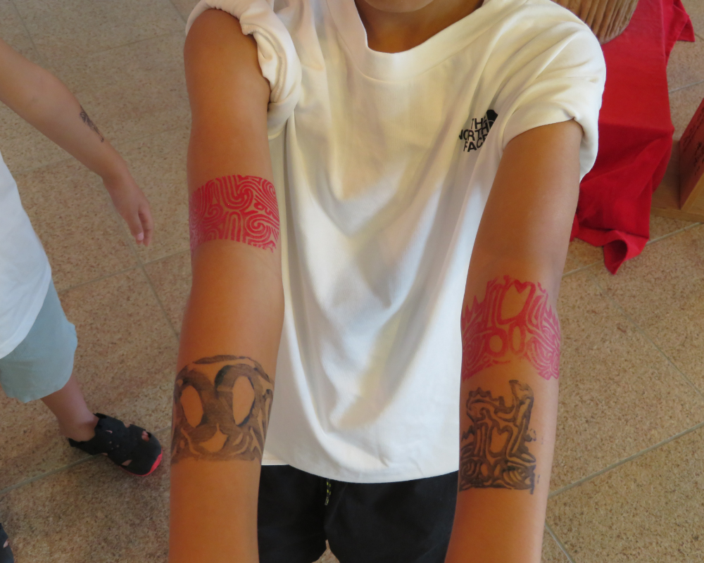 長岡が誇る日本遺産「火焔土器」があなたの腕に!迫力と美しさをあわせもつ縄文の文様を、水性の専用絵具でスタンプします。(絵具は水で落とすことができます)火焔土器をみにまとい、米百俵フェスを盛り上げよう!
