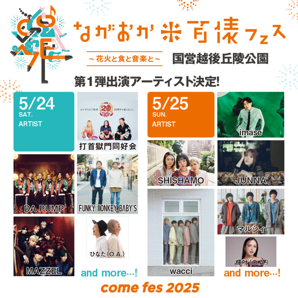 2025年5月24日(土)・25日(日)に国営越後丘陵公園にて開催される「ながおか 米百俵フェス 〜花火と食と音楽と〜 2025」(通称:米フェス)。